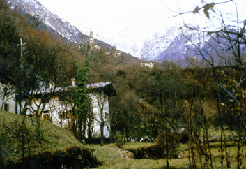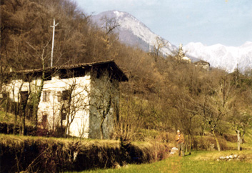 Mühle vor der Restaurierung. In der Wiese rechts steht der Verkäufer des Mühlengrundstücks. Blick in Richtung Norden auf das Dorf Pranzo. Dahinter die Berge des Trentino. Die Mühle liegt mit Blick zum Süden mediterran, mit Blick zum Norden alpin |