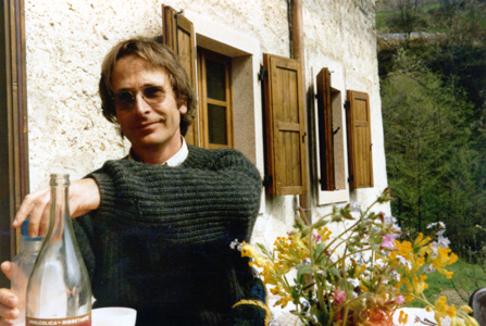 Restaurierung. Rekonstruktion. Frisch gepflückter Blumenstrauss. Ich als zufriedener Entwerfer, Bauleiter und Bauherr nach der Restaurierung, der gern mit angepackt hat. Für mich eine wunderbare, kreative Zeit. Freude, mit Geanni De Gasperi und seinen Mannen das aufgegebene Zeitzeugnis fast unmerklich ins Heute retten zu können. Geanni De Gasperi war mein Bauunternehmer, locker, aufgeschlossen, der meine bis ins Detail mit genauen Vorgaben versehenen, teilweise für ihn ungewöhnlichen Restaurierungswünsche trocken mit den Worten "Tutto è possibile" kommentierte und in perfekter Art ausführte. Später gestand er mir, dass er von mir den Mut gelernt hätte, die Spuren der Vergangenheit als etwas Einmaliges einfach zu belassen, z.B. die Wand auch extrem schief verputzt zu lassen und nicht mit Putzkanten, Maschinenputz und Aluminium-Haustür aus einem alten Haus einen Neubau zu machen. Meine Art, zu lassen, zu restaurieren, zu rekonstruieren war für ihn neu. So etwas kannte 1976 dort niemand. Hinter mir die ausgebesserte Fassade mit rekonstruierten Fensterfassungen in rötlichem Verona-Marmor, Fenstern und Fensterläden des Wohngeschosses. |