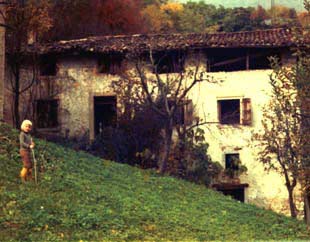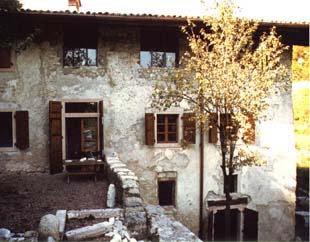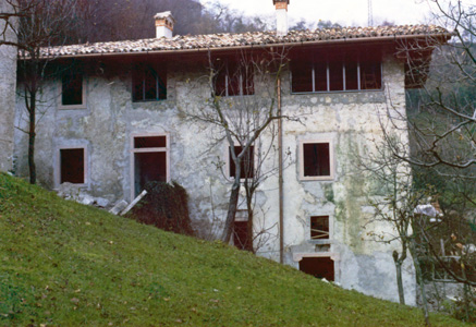 Mühle während der Restaurierung. Rohbau fertig gestellt. Auffällig die Fassade, die wie die alte wirkt: Originale Putzreste, frühere und neue Ausbesserungen sind sichtbar. Warum diese ungeschönte Fassade? Restaurierung bedeutet Wiederherstellen des alten Zustands; ob das der ursprüngliche Neuzustand zweite Hälfte des 17.Jahrhunderts oder der Zustand bei Kauf im Jahr 1976 sein sollte, ist Entscheidungssache. Ich habe mich für den jüngeren Zustand von 1976 mit den interessanten geschichtlichen Spuren und ihren ästhetischen Unvollkommenheiten entschieden. In der mittleren Ebene der Eingang zum Wohngeschoss, links davon das Küchenfenster, rechts davon das Fenster zum Durchgangsbereich und Essplatz, ganz rechts Fenster zu einem der zwei Schlafzimmer. Die Fenstereinfassungen aus rötlichem Verona-Marmor mussten rekonstruiert werden. Auffällig das formal belassene Fenster links im Dachgeschoss. Es hat eine rekonstruierte Marmoreinfassung. Die anderen Öffnungen auf dieser Ebene hatten keine. Der Unterschied erklärt sich daraus, dass links noch ein Schlafraum war und rechts der große Heuspeicher mit den fensterlosen Lüftungsöffnungen. Für den Heuspeicher entwarf ich ein neues Element von Stahlfenstern in rhythmisch lebendiger Gliederung. Unten, durch den Hang halb verdeckt, der Eingang zum hohen Mühlraum mit zwei darüber angeordneten kleinen Fenstern des Mühlraums mit Einfassungen in Granit. Das Dach ist neu gedeckt mit gemischt originalen und neuen Mönch & Nonne-Ziegeln auf rekonstruierter Dachkonstruktion. Zwei rekonstruierte Kamine für Ölheizung und offenen Kamin im Essbereich. Den ruinösen, teilweise eingestürzten und „zusammengerutschten“ Zustand der Ruine beim Kauf habe ich durch (unsichtbaren) Einbau von Stahlbeton im Bereich der zwei Geschossdecken und umfangreiche Sanierung des Mauerwerks, insbesondere durch Rekonstruktion und Systematisierung im Bereich des Dachs korrigiert |