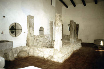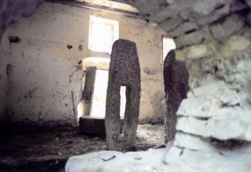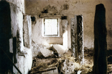 Mühle vor der Restaurierung. Detail des vier Meter hohern Mühlraums mit den originalen Stelen aus Granit, auf denen auf starken Holzbohlen vor 300 Jahren das tonnenschwere Mahlwerk rotierte. Unter dem Fenster ein zerbrochener Mühlstein. Das Stroh zeigt, dass hier nach Einstellung des Mühlbetriebs vor etwa 100 Jahren das Vieh untergestellt wurde. Die Mauern der Mühle wurden mit vielen Bruchstücken von Dachziegeln, Natursteinen, je selbst Holzstücken erstellt. Wohl aus finanzieller Not wurde alles vermauert, was man in der Umgebung fand. Dadurch entstanden in der verputzten Natursteinmauer teilweise tiefe Hohlstellen, sichtbar über und um das Fenster, die zum teilweisen Nachgeben der Mauern führten |