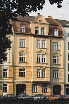 Giebel und Fassade habe ich neubarock rekonstruiert, das Dach neu gedeckt. Bei der Farbgestaltung der Fassade in Nachbarschaft zwischen einem unruhig wirkenden, kräftig gelben Haus mit weiß abgesetztem Stuck und einem erbsengrünen mit braunen Fenstern wählte ich einen ruhigen, sandsteinfarbenen Anstrich. Den Hauseigentümer konnte ich überzeugen, dass neben den "bunten" Häusern eine ruhige Fassade dem Original näher komme, als die von ihm gewünschten kräftigen Lilatöne verschiedener Intensität. Das Haus erhielt 1984 den Fassadenpreis der Stadt München.