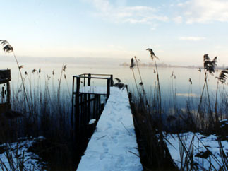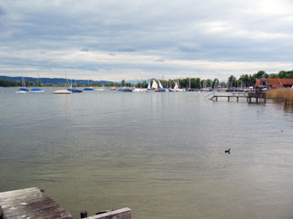 Der Ammersee vom Steg aus. Im Hintergrund die Alpen.