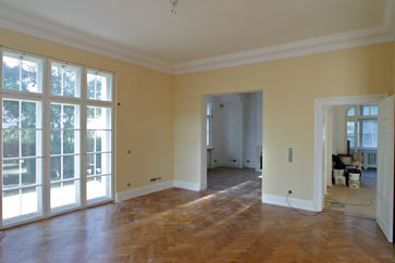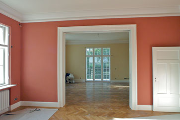 Hochparterre nach der Restaurierung. Mit neuer Technik versehene, hier eingeschobene Schiebetür. Im Hintergrund neuer Ausgang zur neuen Terrasse. Wandfarben nach Wünschen des Bauherren. |