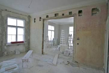 | Hochparterre während der Restaurierung. Links ein historisches Kastenfenster, in der Bildmitte Öffnung der ausgebauten Schiebetür. Darüber eingestemmte Mauertaschen, um die defekte Technik über der Schiebetür auszutauschen. |
