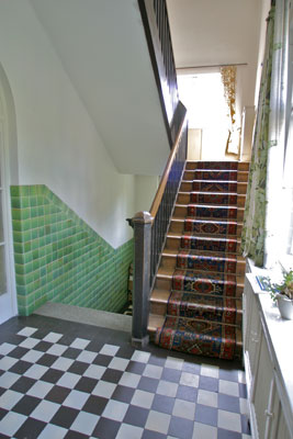 Treppenhaus. Hochparterre vor der Restaurierung. Wunderschönes Treppenhaus im historischen Originalzustand. Bemerkenswert der Gegensatz der Materialien: Schwarz-Weiß-Fliesenboden mit schwarzem, umlaufenden Fries, Holztreppe mit schöner Patina ins Obergeschoss und bescheidene Betontreppe zur Haustür. Interessantes, reiches Zusammenspiel von Schwarz, Weiß, Dunkelbraun, Grau und Kachelofengrün des Fliesenpaneels. Hier darf nichts verändert werden. |