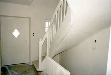 Treppenhaus nach der Restaurierung. Die Wand zur Kellertreppe ließ ich abbrechen; als Geländer dient ein Gußheizkörper. Die ästhetischen Verfremdungen der 70er Jahre wurden entfernt. Jetzt betont das einheitliche Weiß die historische Einfachheit des Treppenhauses. |