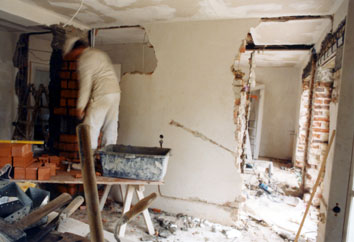 Treppenhaus am Anfang der Restaurierung. Flur mit gemusterten Tapeten. Blick ins Treppenhaus und durch die geöffnete Haustür in den Aluminium-Windfang. Rechts Tür zum Kellerabgang. |