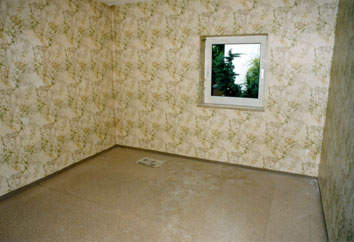 Raum im Obergeschoss vor der Restaurierung. Die leichte Schräge des Krüppelwalmdachs war ursprünglich durch Abmauerung begradigt. Dadurch entstand ein enger Raum. Das Fenster ist für den Blick in die schöne Natur übertrieben klein, es wirkt surrealistisch wie ein Magritte. |