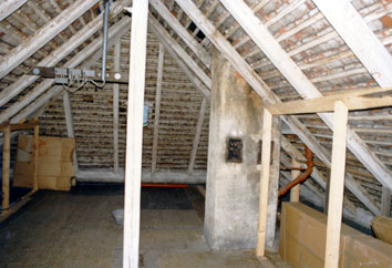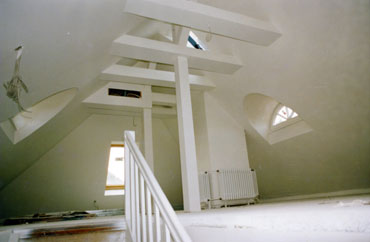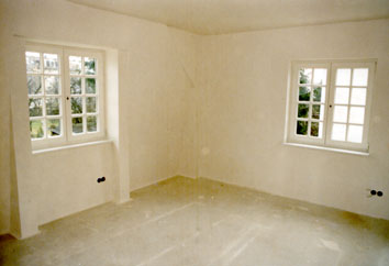 Nach der Restaurierung. Ich ließ die begradingende Abmauerung des leicht schrägen Mansardendachs abbrechen. Die fast unmerkliche Schräge ist jetzt in der Ecke des Raums sichtbar. In diese Schräge ließ ich die Gaube (links im Foto) einbauen. Das übertrieben kleine Fenster im Foto links vergrößerte ich auf ein historisch richtiges Maß. Statt des toten Fensters jetzt zwei historisch richtige Fenster. |