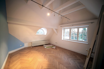 Dachgeschoss. Restauriert. Zimmer mit Rundgaube in Gesamtansicht. Zum Süden neues dreigeteiltes Fenster an Stelle der Fenstertür aus den 60er Jahren. Decke zum Spitzboden ausgebaut. Balken mit Gipskarton verkleidet. Neuer Röhrenradiator unter der Rundgaube. |