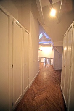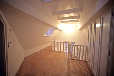 Dachgeschoss. Restauriert. Blick in den Giebel zum Osten, den ich bis in die Spitze öffnete. Die freigelegten, mit Gipskarton verkleideten Balken ergeben ein eindrucksvolles Lichtspiel. Flur mit neuen Wandschränken. Treppenabgang mit restauriertem Geländer. |