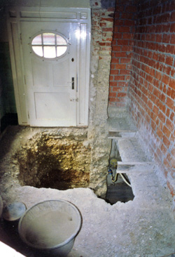 Beginn der nachträglichen Unterkellerung unter dem Eingangsbereich. Den zu schmalen Eingangsbereich habe ich verbreitert, indem ich die Wand unmittelbar rechts neben der Haustür inklusive Fundament abbrechen und im unterkellerten Teil des Nebenraums ein neues Fundament, Kellerwand und die auf dem Foto sichtbare neue Wand etwa 60 cm neben der Haustür mauern liess. Anschließend wurde der Kies unter dem Eingangsbereich ausgebaut, womit hier gerade begonnen wurde. |