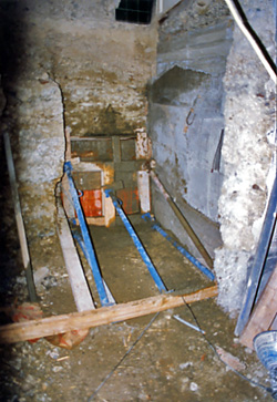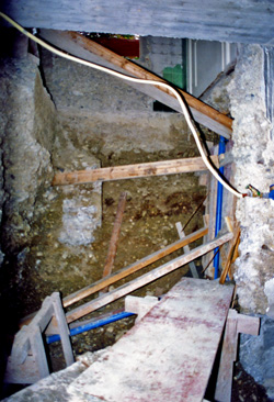 Nachträgliche Unterkellerung. Oben rechts die Haustür. Nach schrittweisem Aushub des Kieses unterhalb des Eingangsbereichs ließ ich die Mauern in versetzter Reihenfolge in vielen Arbeitsschritten mit wasserundurchlässigem Beton (WU-Beton) unterfangen, bis die Raumhöhe des neuen Kellers erreicht war. Rechts Schalung und Abstützmassnahmen. Rampe zum Kiestransport. |