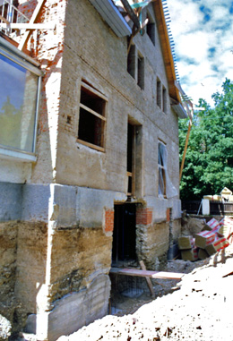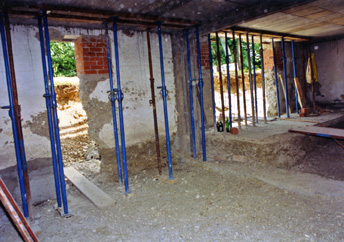 Die bisherigen Keller ließ ich tiefer legen, um Raumhöhe zu erreichen und um einen neuen Bodenaufbau nach Neubaustandard erstellen zu können. Im linken Teil des vergrößerten Raums ist der Kies bereits ausgebaut. Rechts ist noch der Kies und der nur wenige Zentimeter starke alte Zementboden sichtbar. Dazwischen, an der Decke Stahlträger an Stelle der bereits abgebrochenen Wand. Die Wände mussten nach unten verlängert, unterfangen werden. Links vom neu gebrochenen Durchgang ist die Außenwand bereits unterfangen (hellgrauer neuer Beton), rechts steht die Wand noch auf dem Kies. Sichtbar umfangreiche provisorische Abstützmaßnahmen wegen der Durchbrüche der Außenwand mit Beimauerungen zur Kellererweiterung Ostseite. |