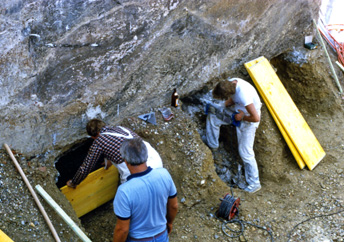 Versetzte Unterfangung einer freigelegten Kelleraussenwand von aussen. An drei Stellen wurde der Kies unterhalb der Wand ausgebaut. Dazwischen blieb der Kies bis zur Unterfangung in einem der nächsten Arbeitsschritte stehen. In der Mitte wird die Unterseite des Fundaments mit dem Abbruchhammer begradigt, danach gut gesäubert. Links wird bereits eingeschalt. |