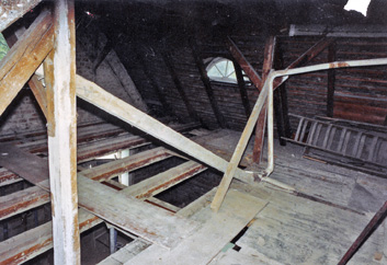 Dachgeschoss. Innenwände ausgebaut. Geschossdecke zur Überprüfung und Verstärkung bis auf Balkenlage freigelegt. |