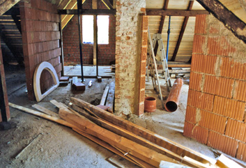 Dachgeschoss. Geschossdecke saniert, wieder geschlossen. In der Mitte in verblassten Ziegeln der alte Kamin. Hellrot die neue Aufteilung mit Ziegelwänden. Im Hintergrund der vergrößerte Spitzgiebel Ostfassade, im Gegenlicht dunkelrotes neues Ziegelmauerwerk um das Fenster herum. Dort habe ich ein zweites Bad für die Kinder eingebaut. Im Raum rechts ist das helle Holz der neuen Schalung auf den alten Sparren sichtbar. Dort am Boden zum Einbau das Rohr für den Wäscheabwurf in den Keller. |