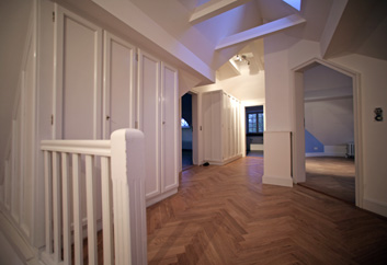 Dachgeschoss. Restauriert. Im Vordergrund Mitte verkleidetes Wäscherohr. Im Hintergrund Mitte Tür zum Bad, rechts und links Zimmer für die Kinder. Links neue Einbauschränke. |