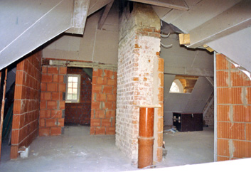 Dachgeschoss. Dachschrägen wärmegedämmt, mit Gipskarton verkleidet. Im Hintergrund das Bad für die Kinder mit Sprossenfenster im vergrößerten Ostgiebel. Im Raum rechts ist die neue Rundgaube mit gesprosstem Fenster bereits eingebaut. Vorm Kamin eingebaut mein obligatorischer Wäscheabwurf zum Keller. |