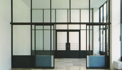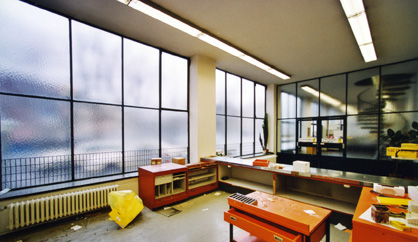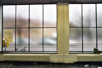 Ehemalige Paketannahme vor der Restaurierung. Glaswand zum dahinterliegenden Eingangsbereich.