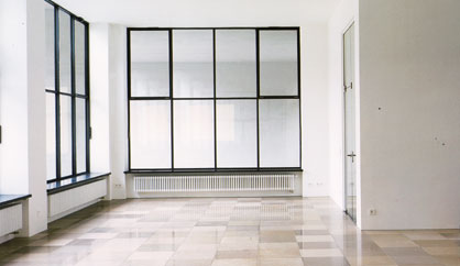 Detail der zartgliedrigen, originalen Stahlfenster vor der Restaurierung.