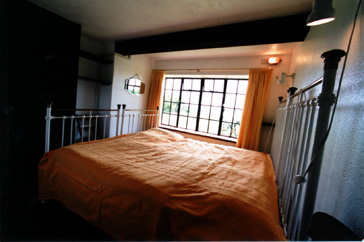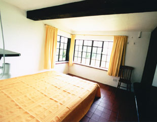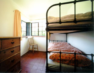 Schlafzimmer mit Georgian Windows, weiß gestrichenen Wänden, rotem Ziegelboden und spartanischer Möblierung vom Flohmarkt. Mit Holzbalken verstärkte Decke unter dem jetzt ausgebauten Dachraum |
