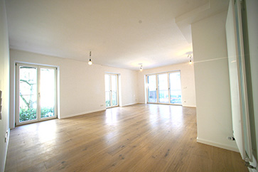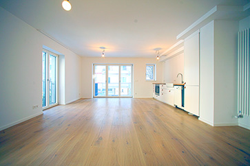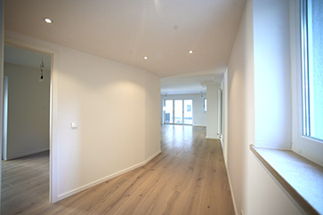 1.OG: Neuer Grundriss. Flur vom Treppenhaus zum Wohn-Essraum. Rechts Kommunwand mit Fenstern zum Nachbargrundstück, links ein Schlafzimmer |