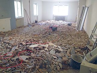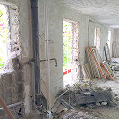 1.OG, Fenster ausgebaut, Abbruch der Fensterbrüstungen, Sichtbar die Betonsteine in den Fensterlaibungen. Wandfarbe abgefräst |