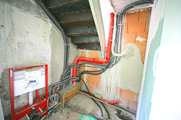 2.OG, unter der Stahltreppe zum DG, Rohinstallation Kinderbad. Aufwändiger Brandschutz durch einzementierte Rohre zwischen den Geschossen, links unten im Foto
